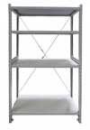 Стеллажи СКУ представляют собой универсальную стеллажную конструкцию из рам и полок с креплениями к стойкам на зацепах. Для обеспечения жесткости в продольном направлении по задней плоскости стеллажа стойки одной секции стянуты крестовиной.