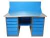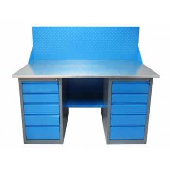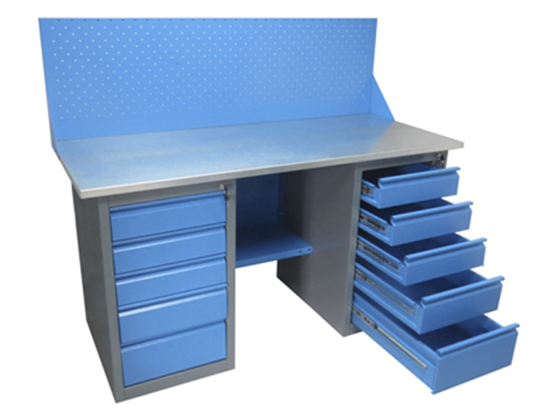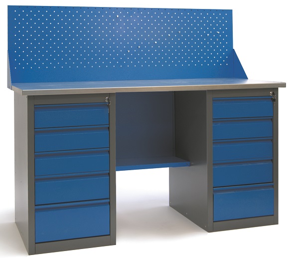 Верстаки, представленные в каталоге, имеют усиленную модульную конструкцию, отличающуюся надежностью. Столешница - это плита МДФ толщиной 25 мм, покрытая листовым металлом из оцинковки. Дополнительная комплектация верстака; это удобная панель для хранения инструментов. Верстак имеет приставную тумбу с полками и ригельным замком. Дверка тумбы может менять свое расположение в зависимости от удобства мастера.